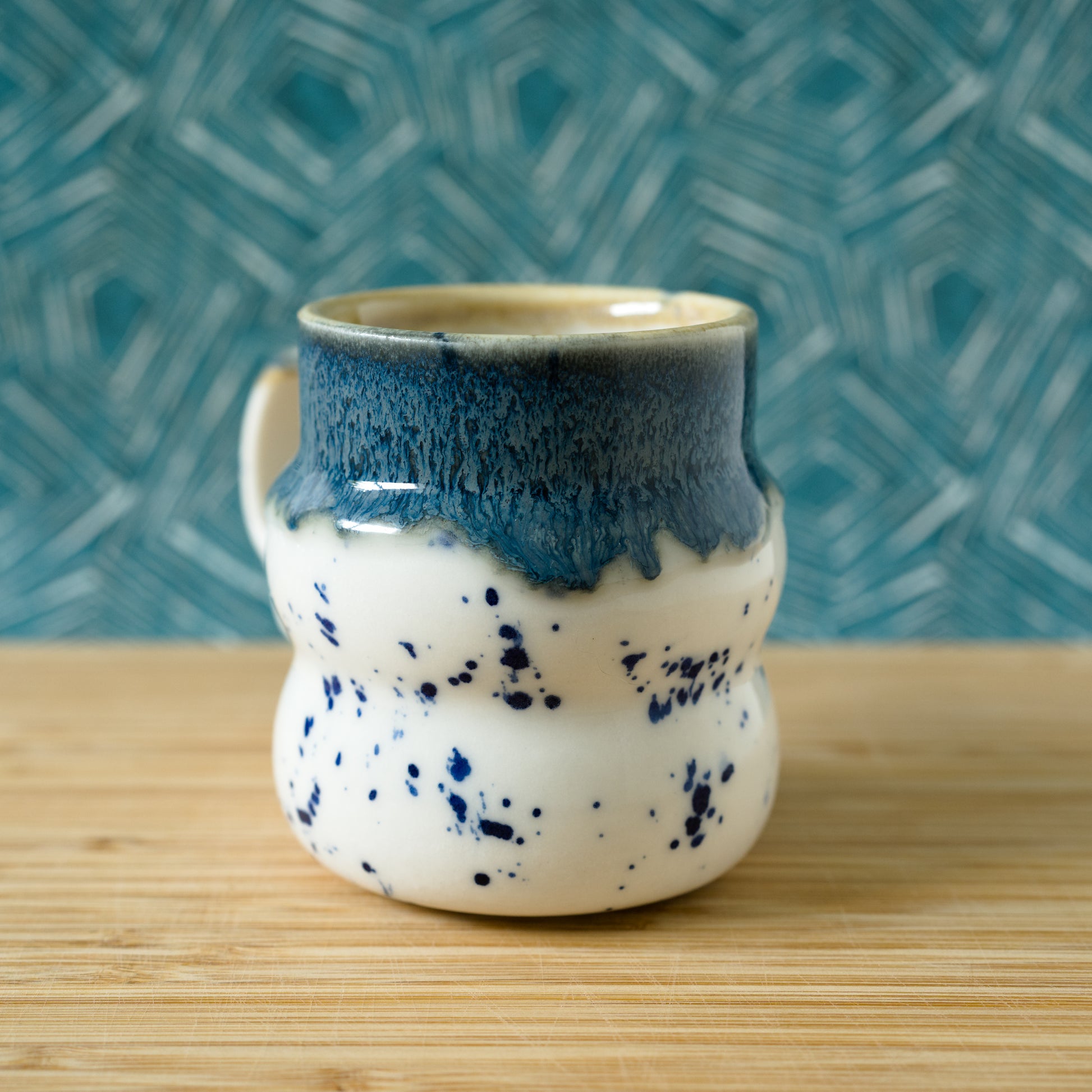 This handmade mug is crafted from white porcelain and decorated with blue flowy glaze with irregular edges on the upper part, and blue splotches under a clear glaze on the lower part. Its wavy shape is matched by a wiggly handle.