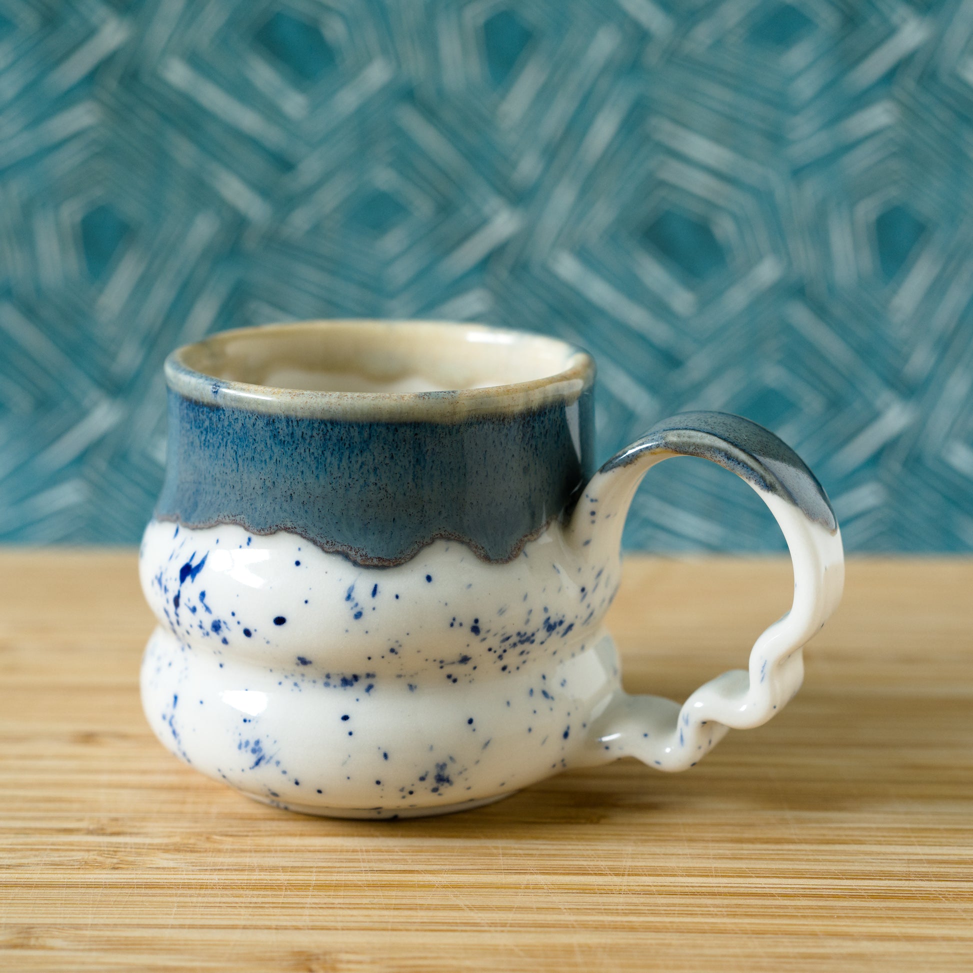 This handmade mug is crafted from white porcelain and decorated with blue flowy glaze with irregular edges on the upper part, and blue splotches under a clear glaze on the lower part. Its wavy shape is matched by a wiggly handle.